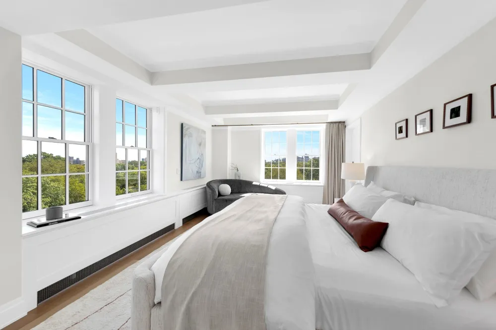 The primary suite enjoys a coveted corner exposure, flooding the space with natural light and commanding views of Central Park. Custom walk-in closet provides ample storage, while the spa-like primary bath is wrapped in floor-to-ceiling Bianca Namibia marble. A double vanity, Kohler fixtures, heated marble floors, built-in glass shelving, and a large walk-in shower all frame park vistas through two expansive windows - an extraordinary setting for relaxation.