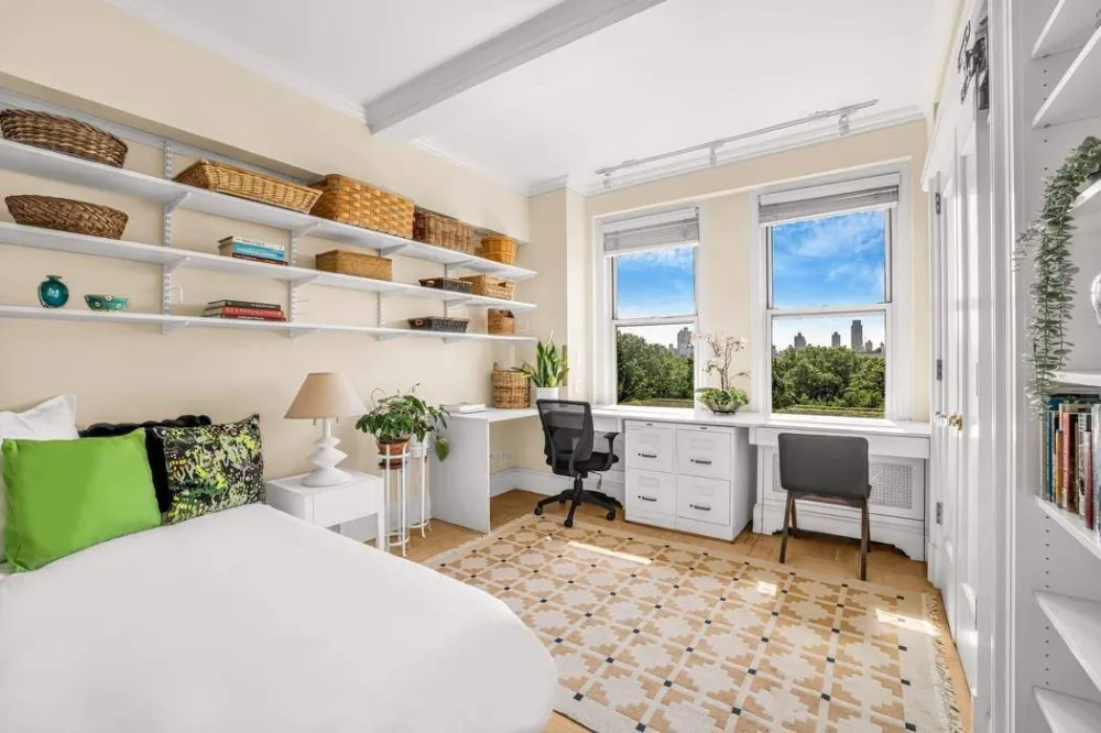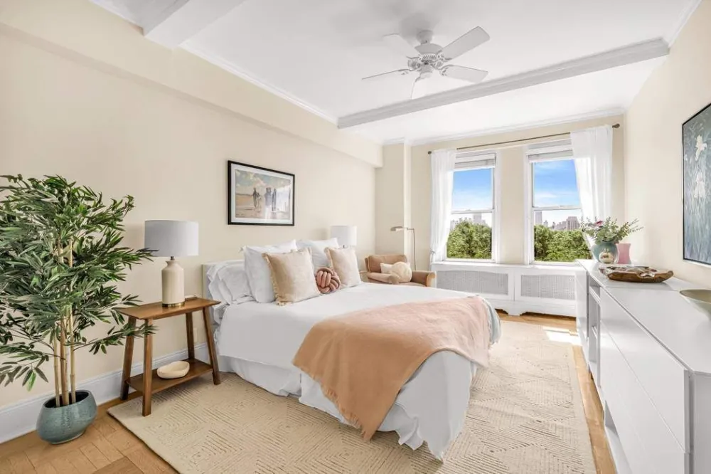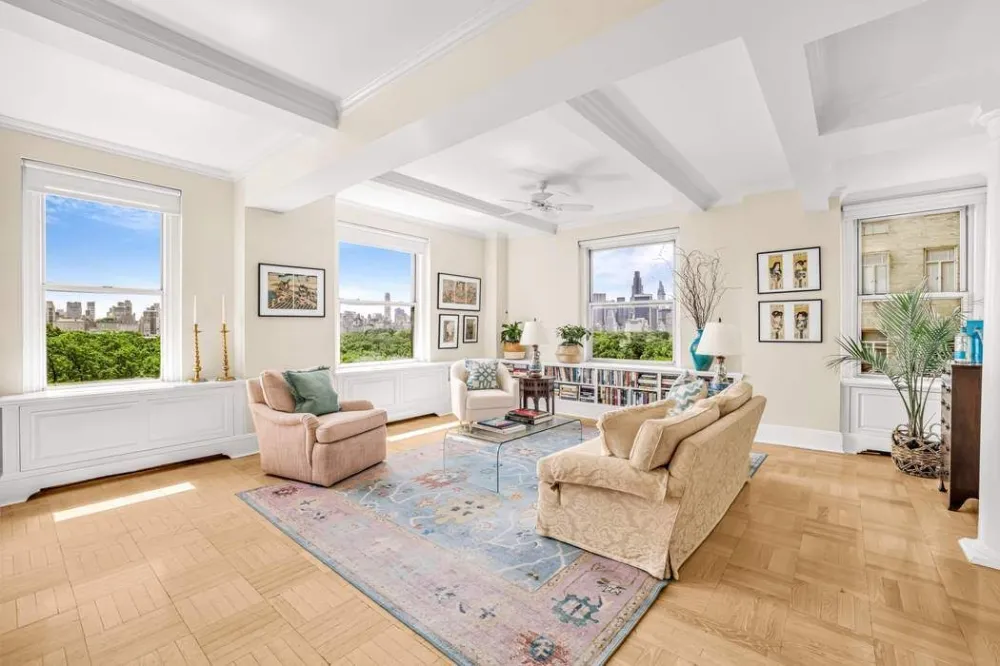 Located on the southeastern corner of the building, this home offers rare, uninterrupted views that stretch across the treetops to Fifth Avenue and Central Park South. Morning light pours through oversized windows, illuminating high beamed ceilings, custom millwork, and a refined open layout that blends classic prewar architecture with modern grace.