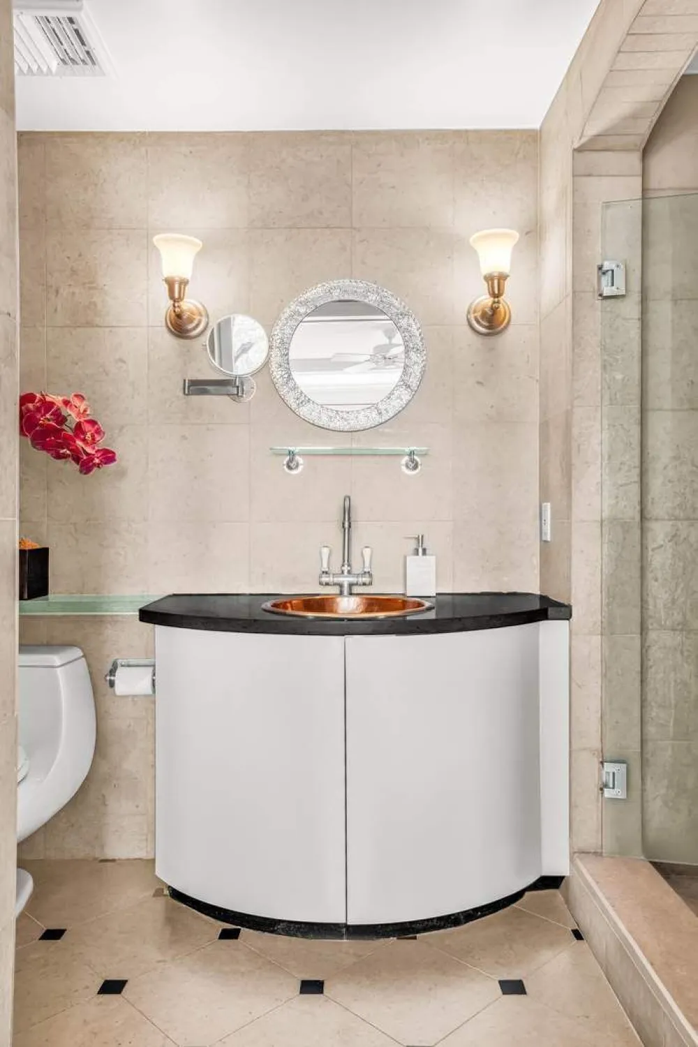 The primary and secondary bedrooms also enjoy park views and gentle sunlight. The primary suite features two large closets, a spa-like glass-enclosed shower, and ample built-in storage. The second bedroom, with custom cabinetry and desk, is ideal for work, study or quiet reflection. Just beside it sits a full guest bath clad in white tile. A laundry closet with stacked Bosch machines adds daily convenience.