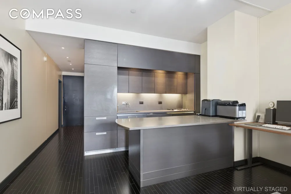 Perched on a high floor with bright, open views, this exceptional studio with a versatile home office/bedroom awaits the discerning buyer. With its high ceilings and ebony-stained hardwood floors, the space exudes a sense of modern elegance. The sleek open kitchen is outfitted with top-of-the-line appliances, including the convenience of an in-unit washer/dryer, making it a perfect blend of style and functionality.