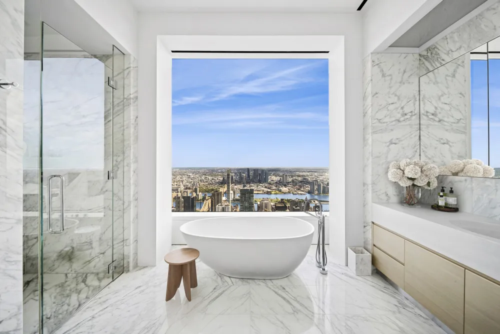 The corner primary bedroom suite has dual south and east exposures and includes a separate dressing hall with extensive closets. The suite has two, windowed primary bathrooms. Each has book-matched slabs of Italian Statuario marble floors and walls, separate shower stalls, and radiant heated floors. The larger of the two baths features a free-standing, deep soaking tub set against the window.