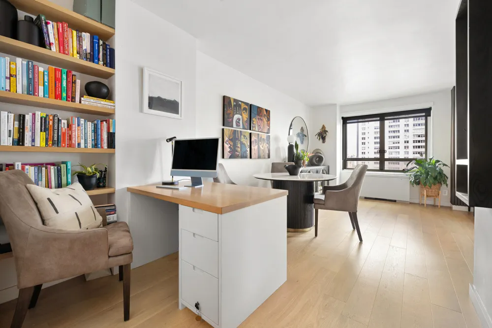 Rich millwork and refined detailing create a warm, tailored atmosphere. A custom wall unit conceals a Murphy bed framed by built-in shelving, blending smart functionality with elevated design. The dressing area offers bespoke closets and generous storage, while a private office with handcrafted cabinetry adds refinement to a work-from-home lifestyle.