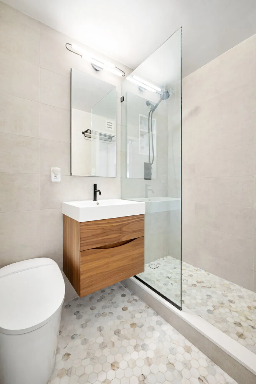 Expansive east-facing windows flood the home with morning light, highlighting newly installed wide-plank oak floors and a serene modern palette. The spa-like bathroom features a floating vanity, designer fixtures, and a heated bidet for everyday indulgence.