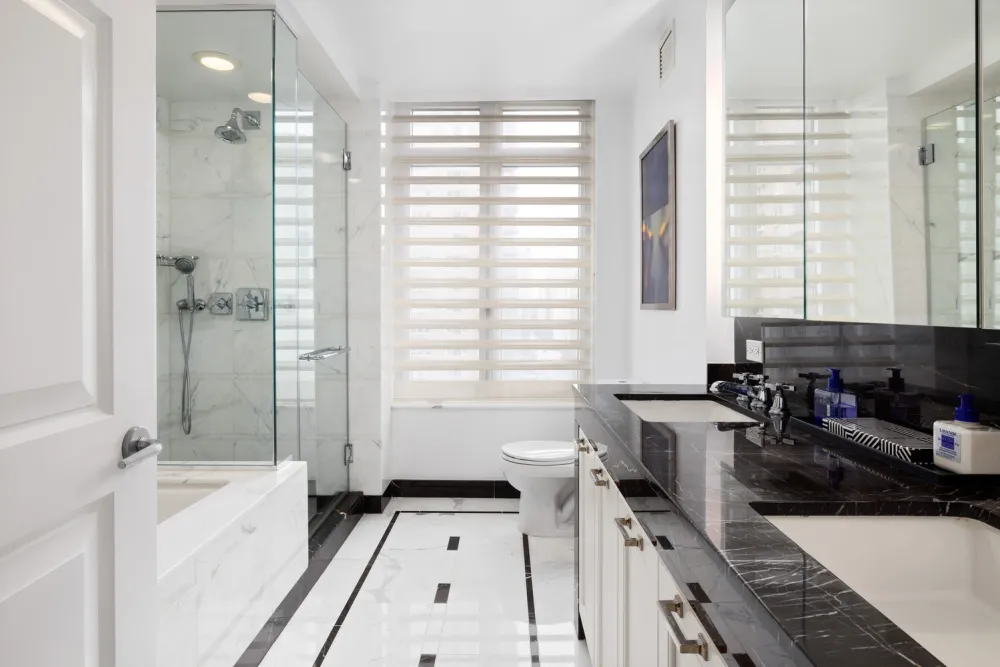 The dramatic primary bedroom is a show stopper! The corner exposure has 2 oversized windows affording wonderful light and views. The primary suite has 2 walk-in closets and an en suite windowed, spa-like luxurious marble bathroom equipped with 5 fixtures and features a double custom vanity (2 sinks), wide rimmed soaking tub, and separate glass enclosed shower.