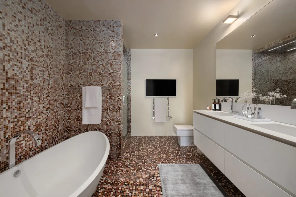 Upstairs, the private level is home to two bedroom suites with refined proportions and exquisite materials. The primary suite includes a custom McIntosh AV video/ audio system, custom closets with built-in safe, and a spa-grade en-suite bath. Every bathroom in the home is finished with Bisazza tiles, Boffi fixtures, Zuma and Hastings clay mineral deep soaking tubs, and Dornbracht and Fantini systems.