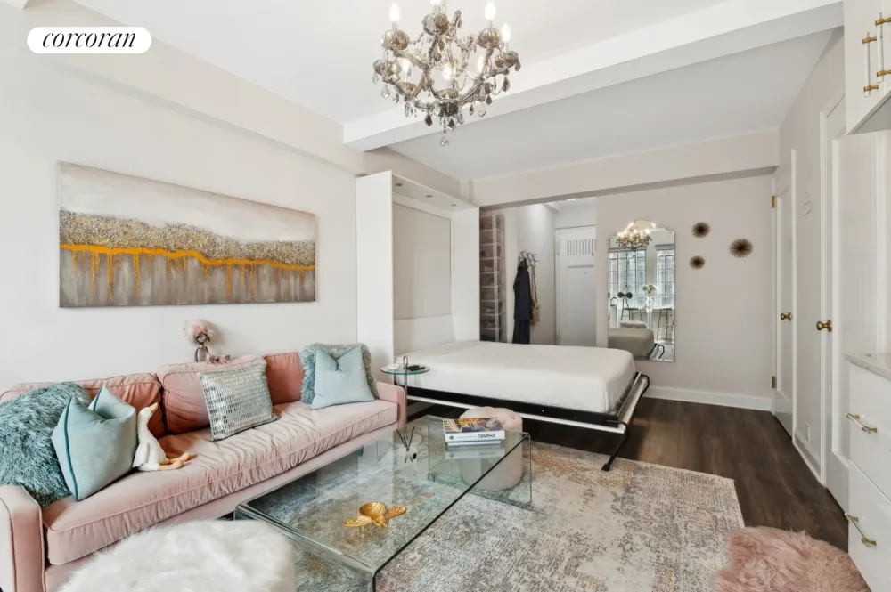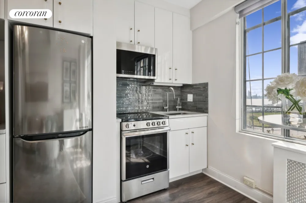 Offering panoramic views of the East River, Tudor City Park, and the iconic NYC skyline, this stunning studio sits on the equivalent of a 6th-floor perch. Nestled high above 42nd Street and First Avenue, this beautifully renovated home is pin-drop quiet, thanks to pre-installed city windows, and bathed in abundant southern light. Although located on the 3rd floor, Tudor City's unique elevation gives it the feel of a 6th-floor retreat. The renovation includes new flooring, a fresh paint job, a brand-new kitchen, Murphy bed and custom California closets, ensuring a luxurious living experience. Move-in ready with every detail carefully considered, all that's left is for you to unpack and relax. The ideal pied- -terre, first home, or city getaway you've been waiting for!