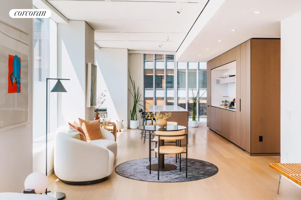 The Foster + Partners-designed open chef's kitchen features wire-brushed oak cabinetry with integrated pulls and bronze detailing, cabinet-fronted Gaggenau stainless steel appliances, and Italian Carrara marble knife edge countertop and backsplash with embedded ventilation and LED lighting - a true culinary delight that allows for seamless entertaining.