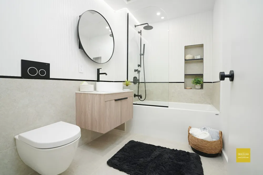 Oversized west-facing windows flood the home with natural light, creating a bright and inviting atmosphere. The serene bedroom features a generous double-door closet and plenty of room to unwind, while the spa-inspired bathroom is finished with refined tile-work, a custom floating vanity, and a deep soaking Maax tub-bringing a boutique-hotel luxury feeling.