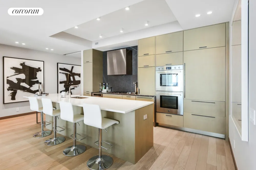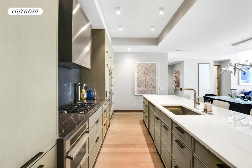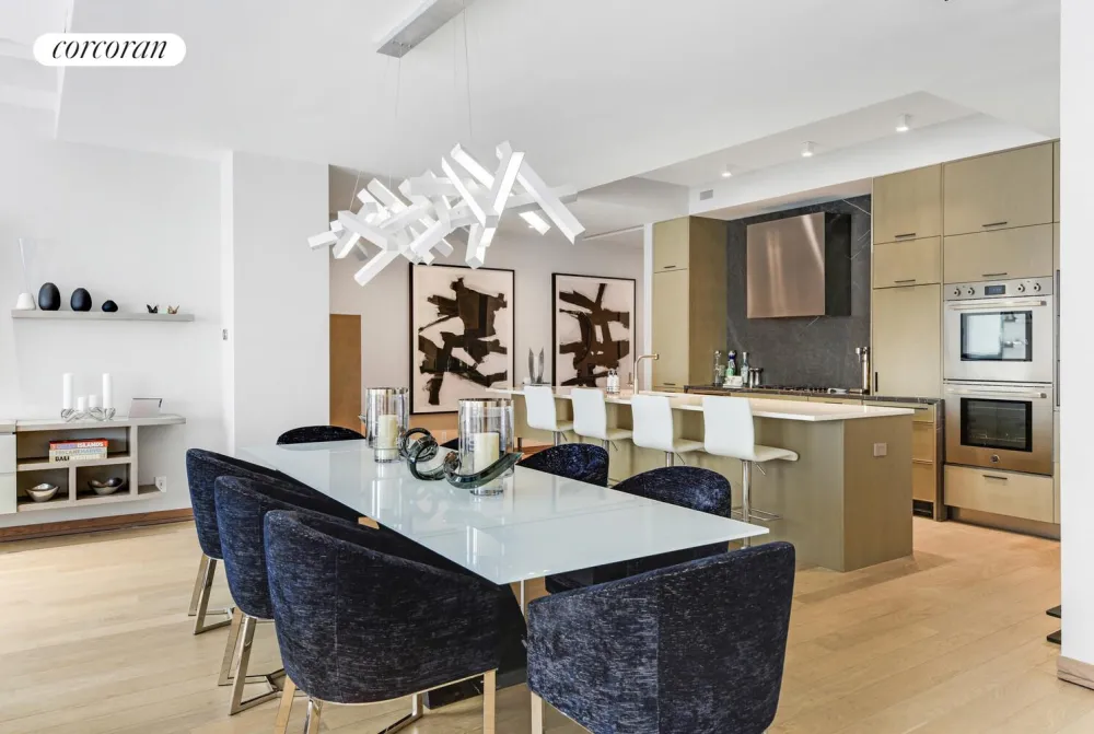 The home opens into a loft-like living and dining space with north and east exposures, filling the interiors with natural light and vibrant city views. The chef's kitchen is equipped with top-of-the-line appliances, custom cabinetry, and refined stone finishes-perfect for both daily living and entertaining.