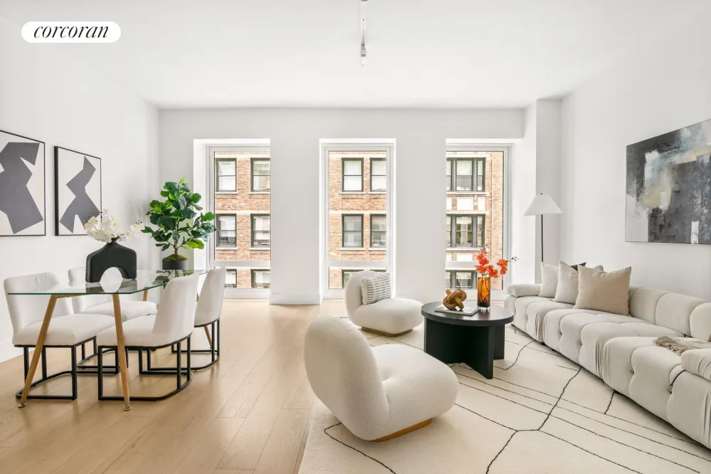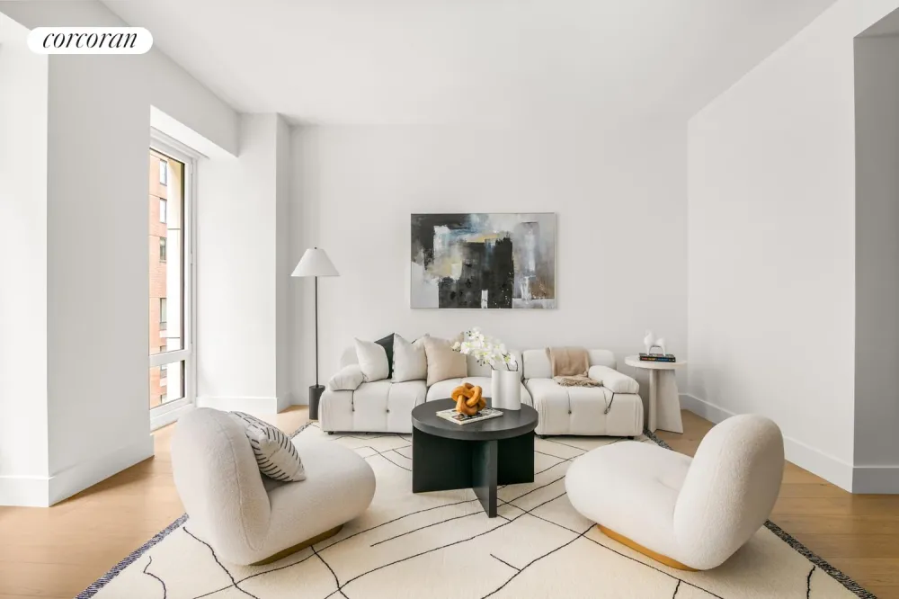 Residence 5M is an impeccably designed one-bedroom, one-and-a-half-bath home that combines modern elegance with everyday comfort. This unit is one of the largest oversized One-Bedroom homes in Park Loggia. A welcoming entry foyer flows into a spacious open style kitchen, south-facing living room featuring soaring close to 10-foot ceilings, three nearly floor-to-ceiling windows that bathe the space in natural light. The open layout creates a loft-like ambiance, ideal for all relaxation, working from home, and entertaining.