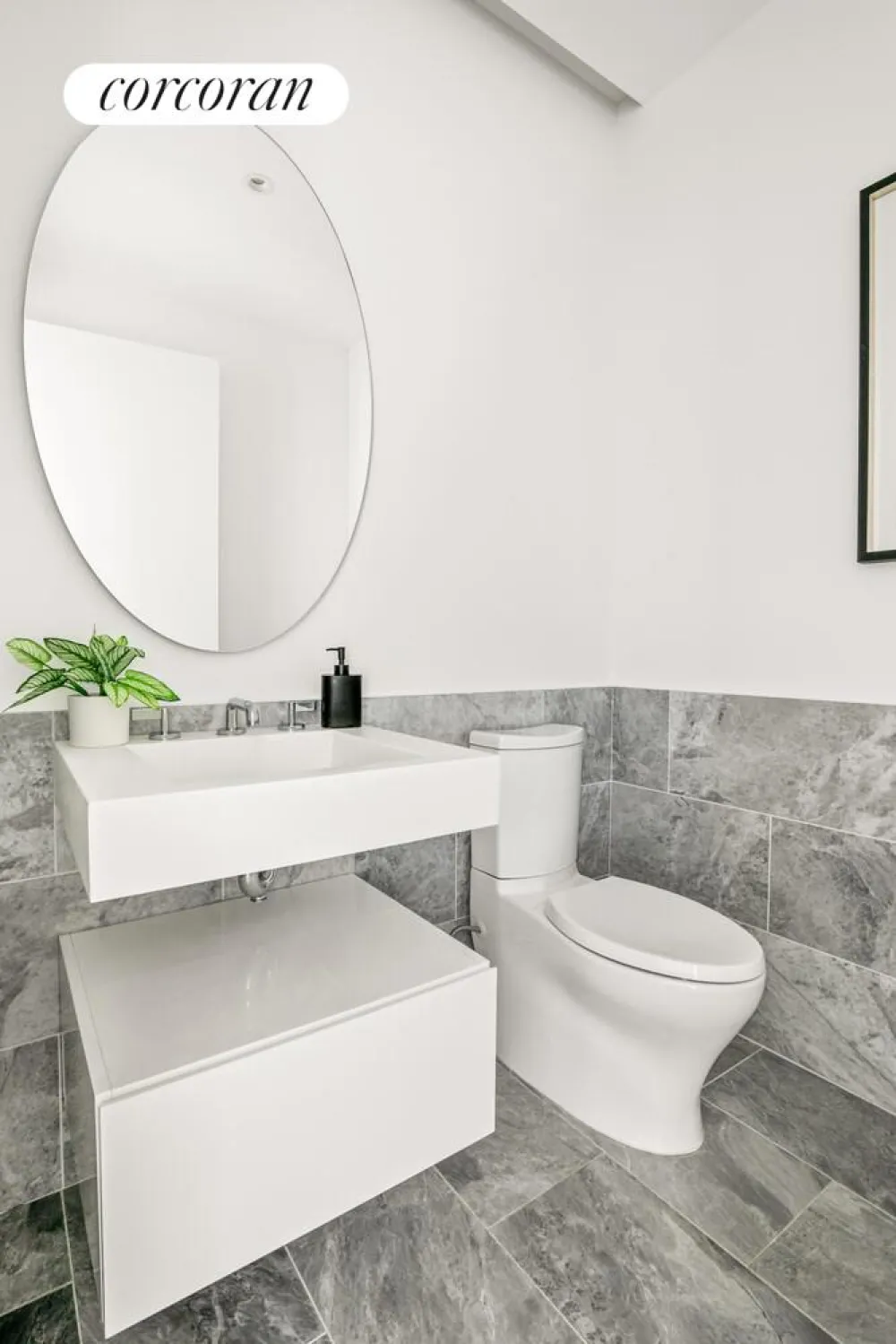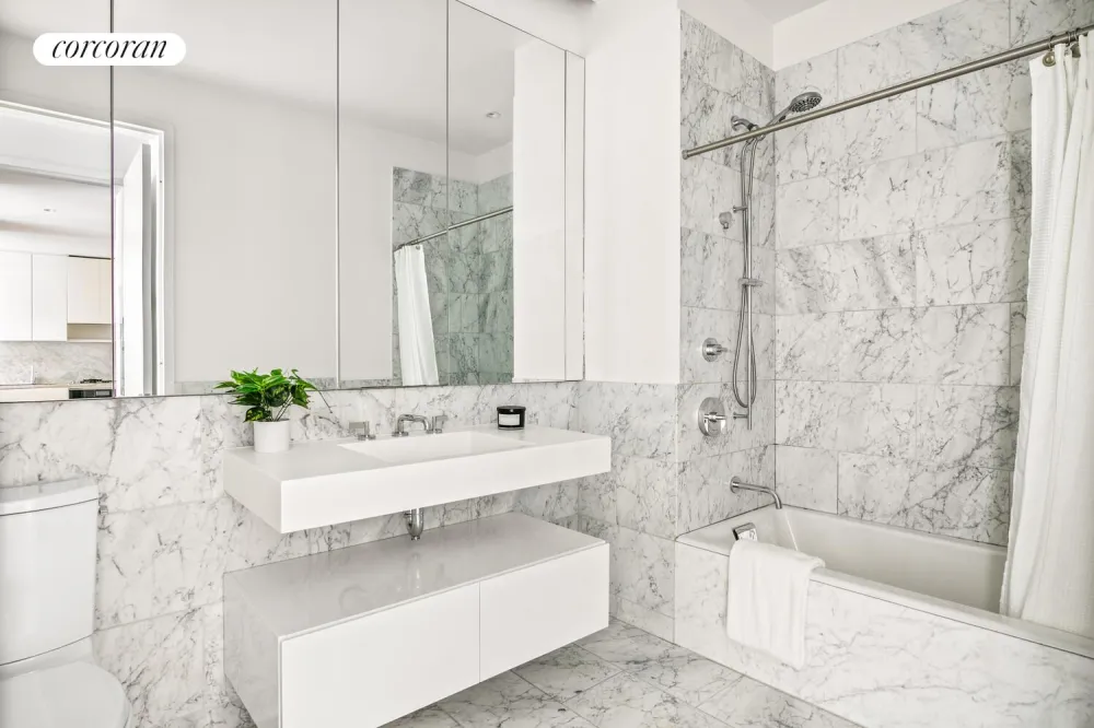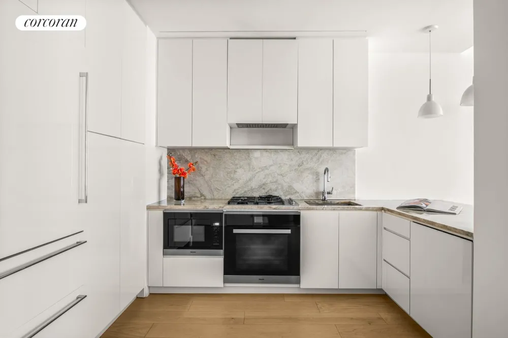 The chef's kitchen is a culinary haven, outfitted with sleek quartzite countertops, a suite of premium Miele appliances, and a stylish breakfast bar, perfect for casual dining or morning coffee. The serene king-sized primary suite offers a luxurious marble bathroom, an expansive walk-in closet, and convenient in-unit amenities, including a GE washer and vented dryer.
