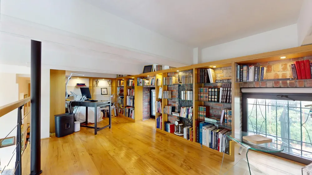 Lofted mezzanine office with breathtaking views over the entire home and the park beyond