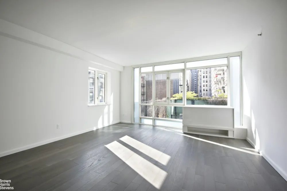 Floor-to-ceiling windows frame bright city views in this spacious one bedroom, one bathroom home. The entry foyer with a large coat closet leads to an open kitchen that is appointed with glossy white Italian lacquer cabinetry, honed marble countertops and backsplashes, an integrated Sub-Zero refrigerator... See more