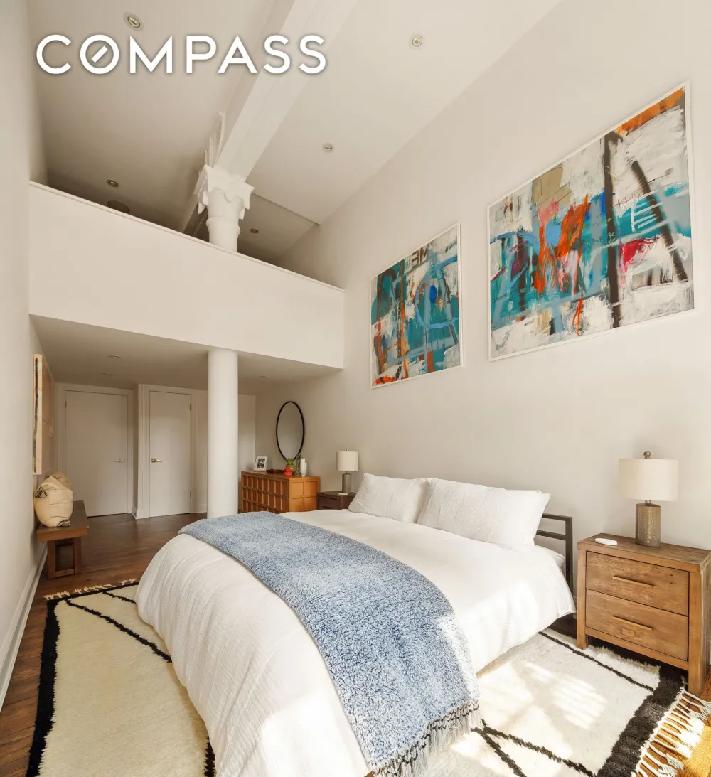 The king-sized primary bedroom is a peaceful retreat with two large east-facing windows, 14-foot ceilings, and a custom-built walk-in closet.