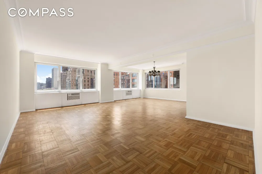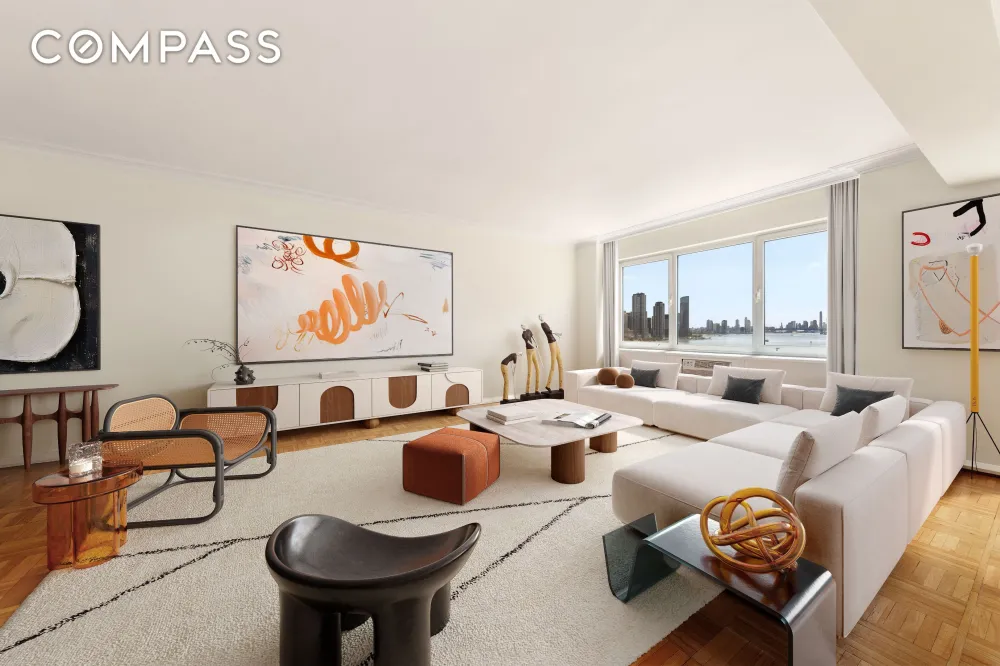 Bathed in natural light and framed by expansive high-floor views of the East River and Manhattan skyline, this approximately 1,600-square-foot corner residence offers an exceptional layout and endless potential. With nine oversized picture windows, the open-concept living and dining area is a true showstopper—bright and airy by day, and glowing with city lights by night.
