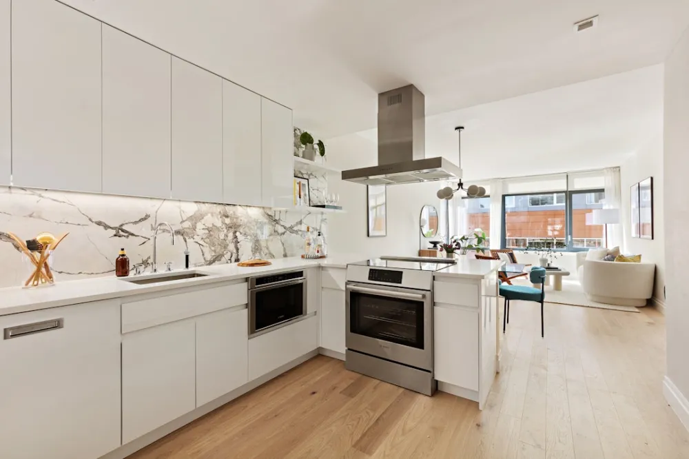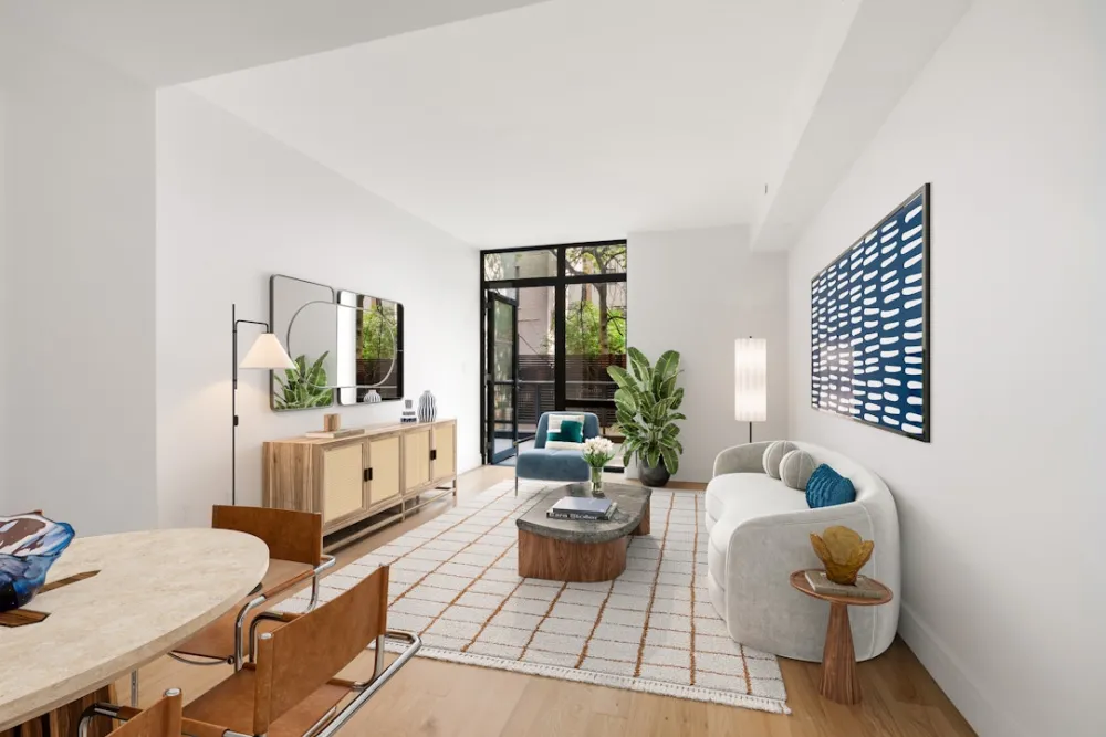 Experience sustainable luxury in this abundant and oversized 2 bed 2.5 bath duplex residence with a cavernous and flexible recreation room and glorious private outdoor spaces at The Dovecote, where design, functionality, and Passive House converge seamlessly. This home features two levels of pin drop quiet living with premium interior finishes, sound-attenuating windows for natural light, timeless white oak flooring, and an efficient VRF HVAC system. The heart of the home includes a cook's kitchen with Caesarstone countertops, Porcelanosa backsplash, custom lacquered cabinetry, and a prominent Bosch stainless steel appliance suite. The recirculating hot water system adds efficiency and reduces waste. The primary bath is a clean design sanctuary with Persian white Porcelanosa floor tiles, Carrera Blanco wall tiles, a custom lacquered vanity with a Caesarstone countertop, and a walk-in shower with Grohe fixtures. The secondary bath combines Travertine-look porcelain floor tile, Italian glazed white porcelain wall tile, and a spacious soaking tub with polished chrome Kohler fixtures. Indulge in unparalleled sustainable living at The Dovecote.