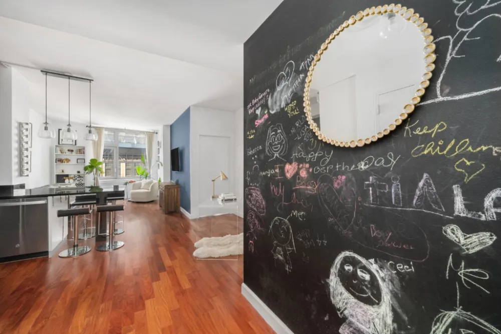 The bright home features an open living/dining area with oversized windows, hardwood floors, and a sleek open kitchen with stainless steel appliances, granite countertops, and a breakfast bar. The king-sized bedroom is serene and inviting, while the marble bathroom includes a spa-like soaking tub. Unique touches such as an accent wall and chalkboard entry add personality and charm.