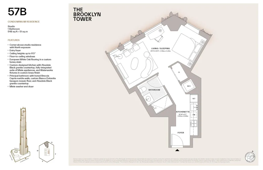 One of the highest studios in Brooklyn history at 581' in the sky, Residence 57B at 548 square feet is an elegant and spacious alcove studio featuring impressive north-facing exposures of the Empire State Building, Hudson Yards, Statue of Liberty, and the Brooklyn Bridge. This prestigious studio that boasts the most coveted views of the iconic Manhattan skyline features interiors by AD100 firm Gachot Studios. Radically imagined by award-winning SHoP Architects, The Brooklyn Tower is Brooklyn's tallest building, rising over 1,000 feet into the skyline. WELCOME TO THE FUTURE OF BROOKLYN.