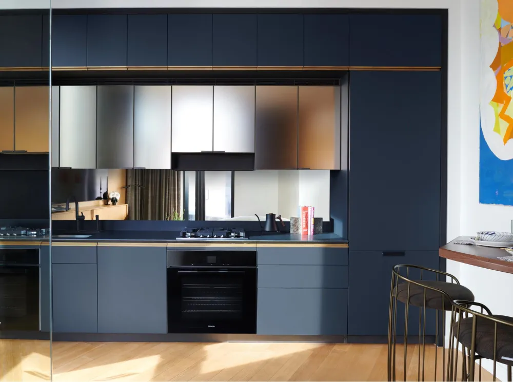 As you enter the studio, you are welcomed by a spectacular kitchen designed by Gachot Studios, featuring striking graphite matte black and etched bronze mirror cabinetry, a polished bronze mirror backsplash, and Absolute Black granite countertops. A fully integrated suite of Miele appliances and Waterworks fixtures in a custom brass finish complete the exceptional experience. The studio features four floor-to-ceiling windows with northern exposure and ceiling heights up to 11', offering a rare vantage point to enjoy New York City sunsets.