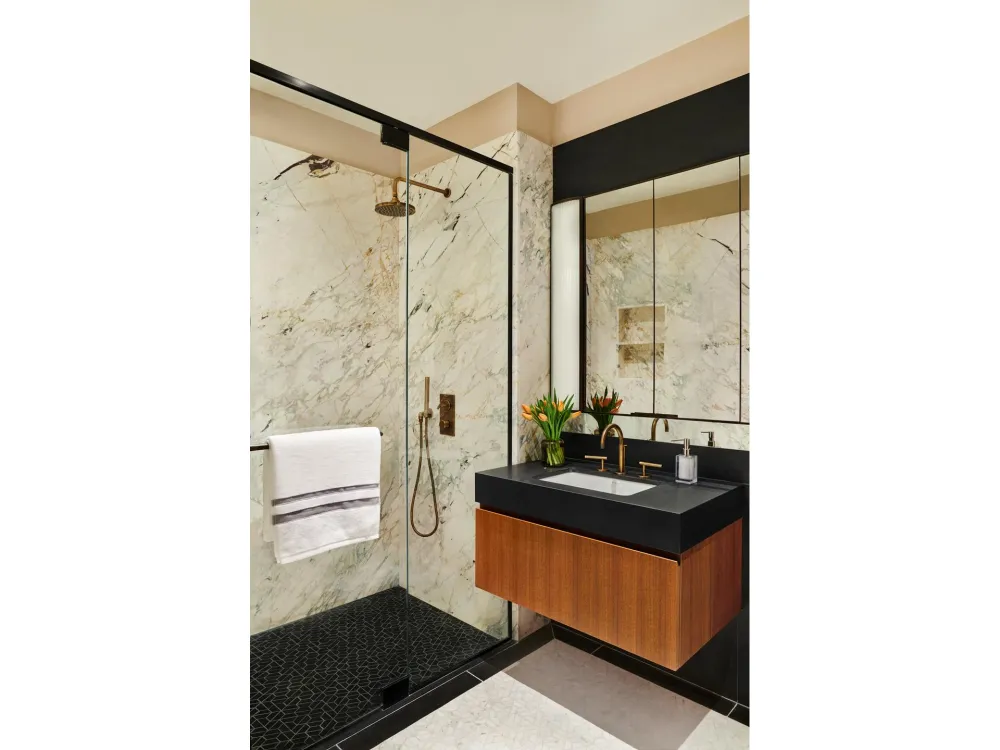 The principal bathroom features walls sheathed in expressive Breccia Capria marble, complemented by Absolute Black granite and white Bianco Dolomite marble flooring in a hexagonal pattern. A custom vanity in a light mahogany finish features an Absolute Black granite countertop, Waterworks fixtures in a custom brass finish, and integrated fluted glass sconces. Additional residence features include Miele washer and dryer and zoned HVAC system for maximum comfort and flexibility. Experience Brooklyn's finest, where unrivaled design meets unmatched views.