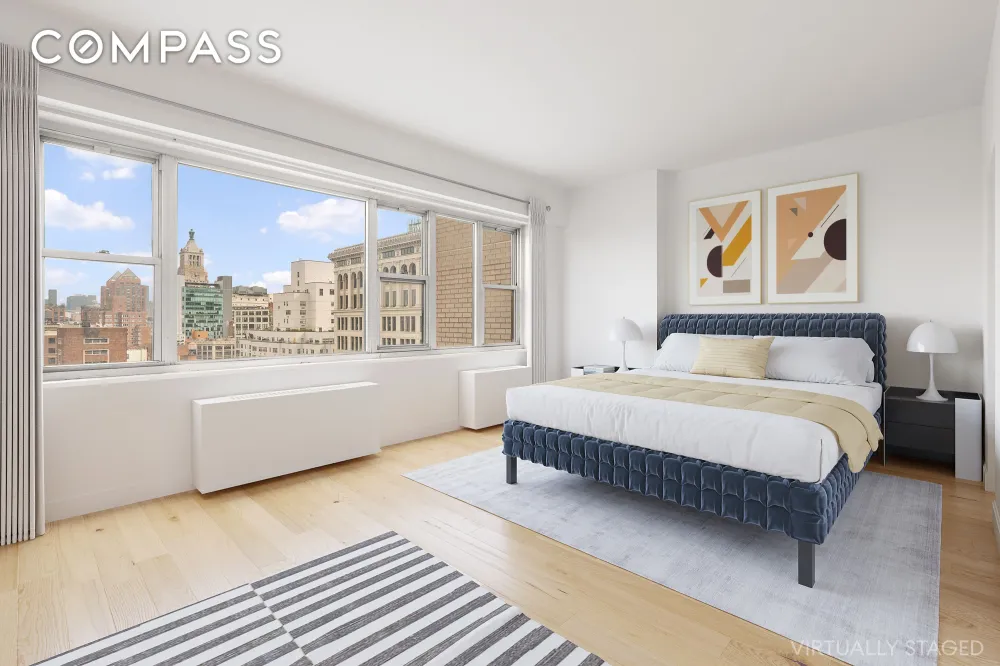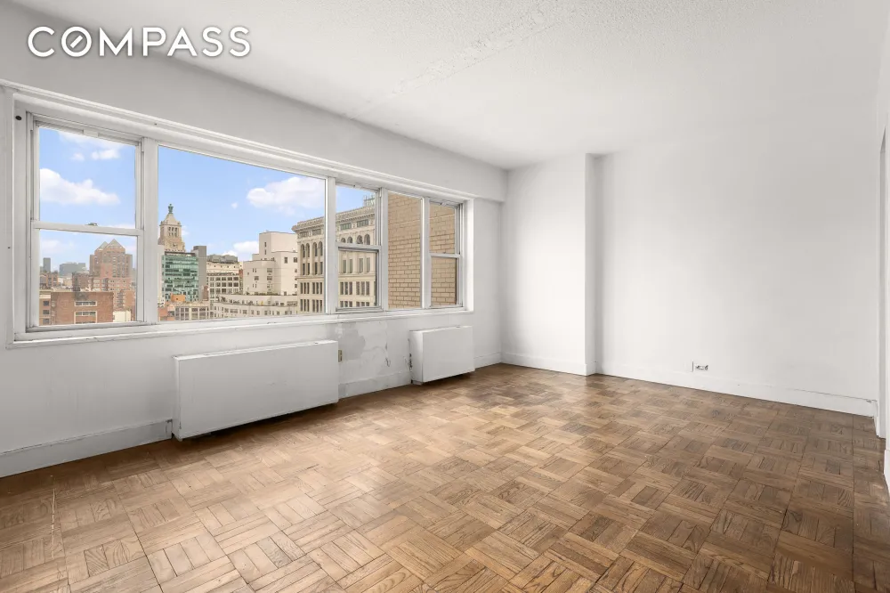The apartment enjoys wide northern exposures, filling the space with natural light and showcasing sweeping views of the city skyline. With a spacious layout and solid bones, 18J is a rare blank canvas for buyers seeking to renovate and design a home entirely to their own taste. The apartment was originally configured as a windowed one-bedroom with ensuite bathroom.