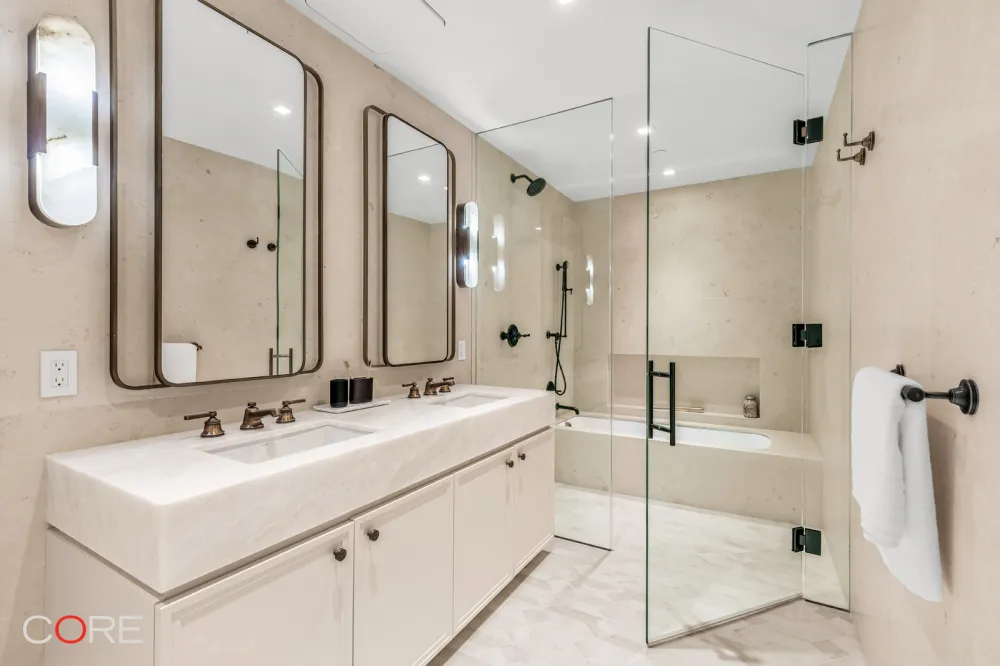 All three bedrooms are tucked down the hall and provide the utmost privacy from the entertaining areas of the home and are bathed in sunlight throughout the day. The primary bathroom is a sanctuary of refinement, enveloped in Crema Luna limestone complemented by Namibia white marble. Radiant heated floors and high-end plumbing fittings from WaterWorks elevate the luxurious experience. Additional features of this apartment include a separate powder room, white oak flooring, solid core wood doors with Valli & Valli hardware, a side-by-side washer and dryer, and a high-efficiency central VRF system for heating and cooling.