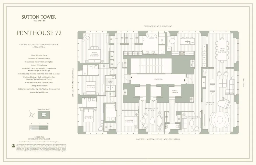 Commanding an entire floor, Penthouse 72 at Sutton Tower offers a truly breathtaking vantage point with uninterrupted 360-degree views of New York City’s skyline, rivers, and iconic landmarks. Designed by renowned architect Thomas Juul-Hansen, this sprawling 4,765-square-foot residence features 4 bedrooms and 4.5 baths, with every room oriented to maximize light, space, and the city’s ever-changing vistas. Direct elevator access opens into a dramatic great room with soaring 15-foot ceilings and southeastern exposure, framed by floor-to-ceiling windows that flood the space with natural light. The north-facing kitchen is a showpiece, featuring a Statuarietto marble island, Italian matte lacquer cabinetry, and a full suite of Sub-Zero and Wolf appliances, seamlessly connected to a formal dining room with sweeping northeastern views.