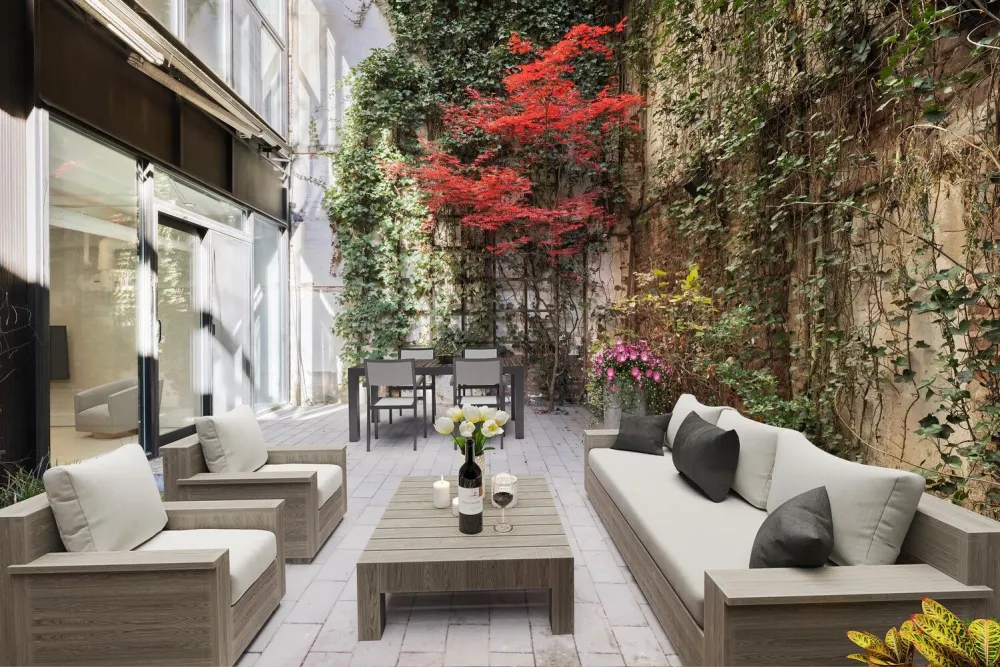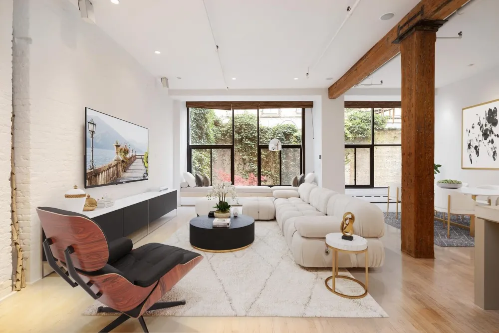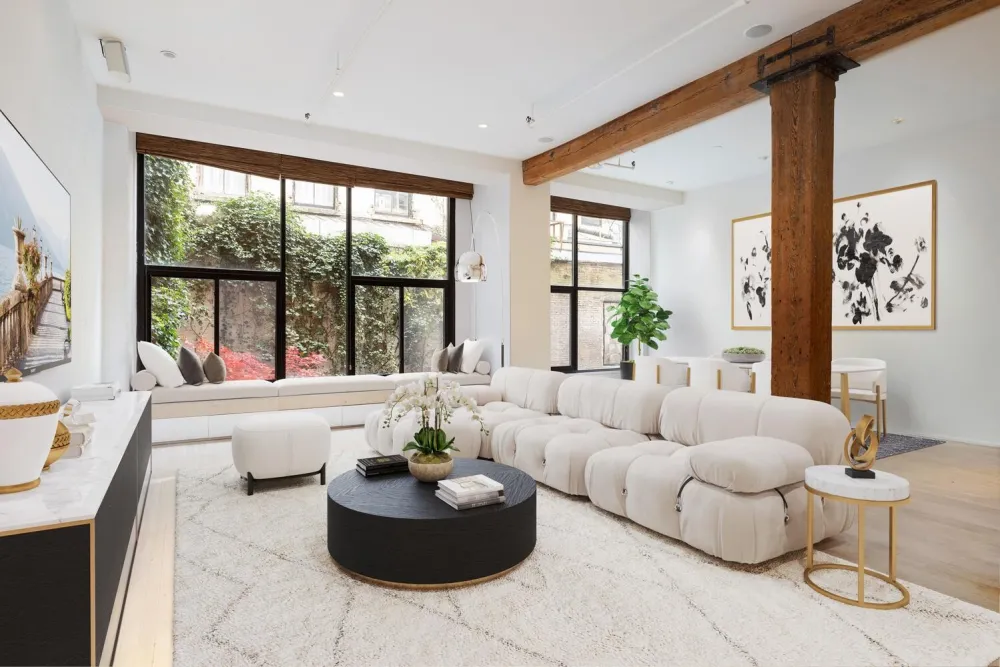 Spacious, serene and virtually staged, this architecturally significant and pin drop quiet 2 bedroom, 2 bath, duplex loft features extra high ceilings, original exposed brickwork and hand-hewn wood beams, and first level with an inviting reception area, an open chef's kitchen with large dining island and a huge great room with floor to ceiling windows facing the private planted terrace, formerly a 19th century horse mews. The lower, bedroom level is accessed via a chic floating staircase and offers a primary suite with separate dressing room and terrace access, a large second bedroom and bathroom, laundry room, one or two flexible offices/dens, plus a storage room w/ abundant closet space.