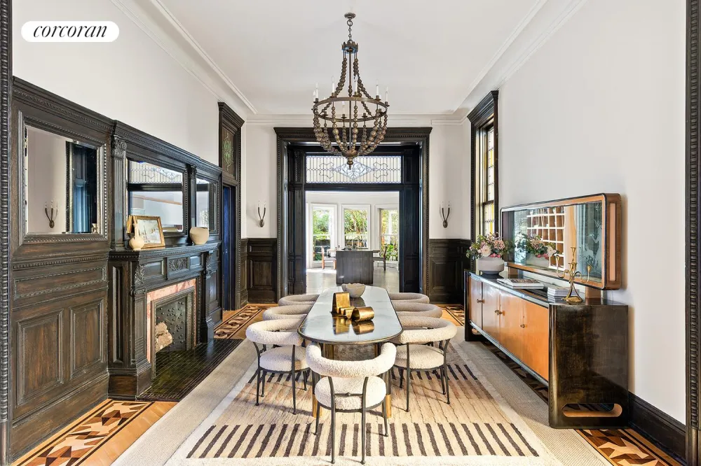 Spanning roughly 10,000 square feet over five stories, the layout offers seven bedrooms and six full bathrooms (plus additional half baths) across its elegant wings. The parlor level, stretching about 105 feet deep, hosts formal living and dining salons, a generous sitting room, and a chef's kitchen enlivened by a rear extension of curved glass and custom copper roofing. The upper floors accommodate the principal suite, multiple ensuite bedrooms, a library or study, and gracious secondary rooms.