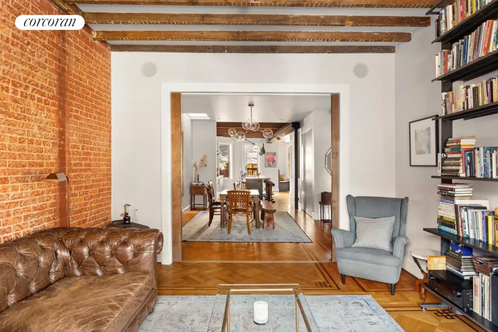 This is the Greenpoint home that you have been waiting for a rare gem built 21" x 62" that has been renovated from top to bottom on a landmarked block between Manhattan and Franklin avenues. This impressive turn-of-the century home with a welcoming and rustic aesthetic offers three loft-like floors that have been built extra deep, allowing for wonderful light-filled spaces, including side windows, and less stairs than a typical townhouse. Move right in to a mint condition home, no work required, on a bucolic block, with easy access to greenspaces including Transmitter Park, and endless amenities in every direction. Designed to perfection, this warm and spacious townhouse offers the best of the old and the new worlds. Exposed timber beams, burnished steel columns, original plaster lincrusta, and preserved Arts and Crafts woodwork details throughout blend harmoniously with a renovated chef's kitchen, central heating and cooling, new windows, and modern light fixtures.