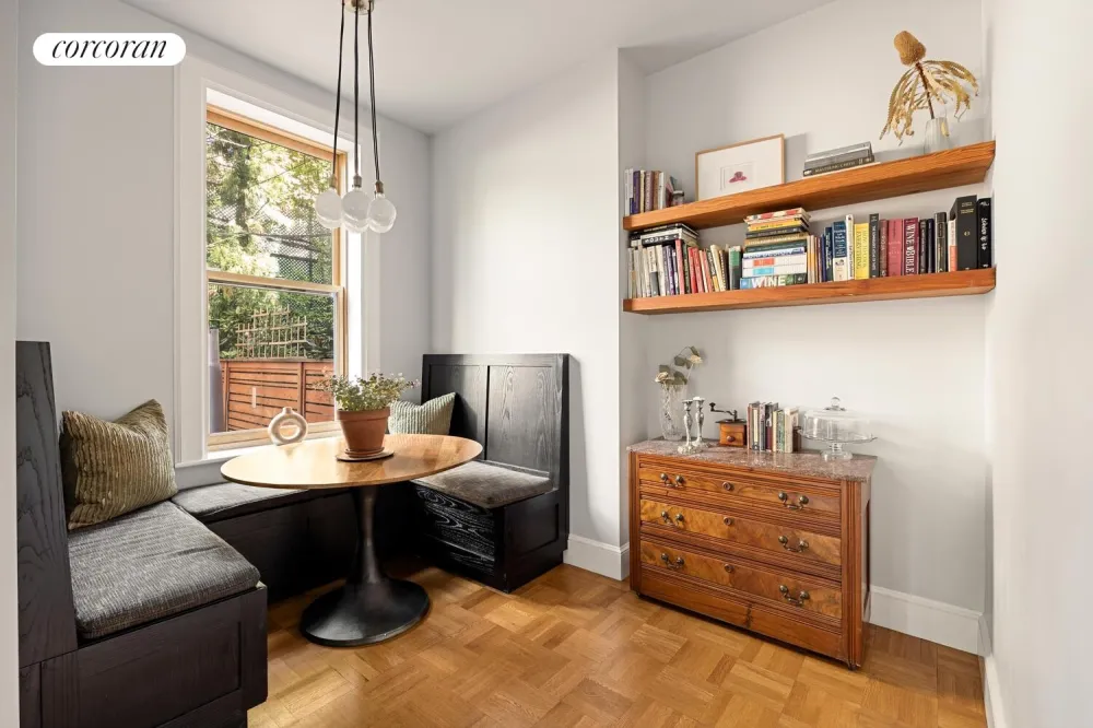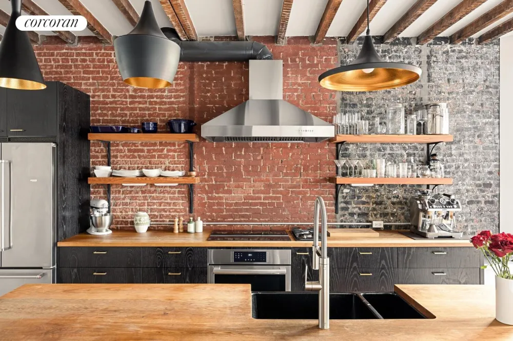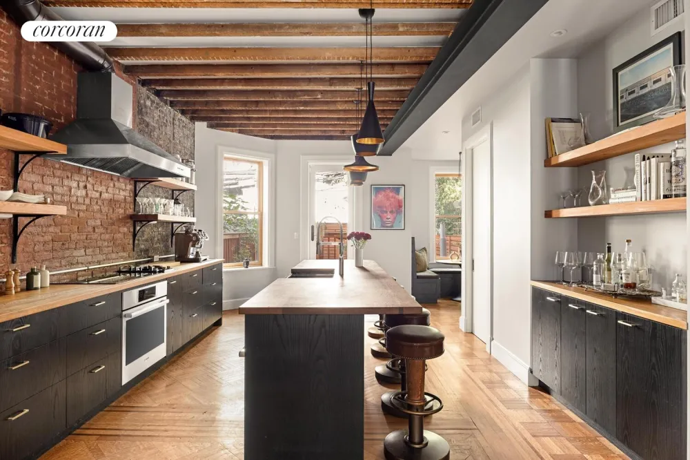 The perfect layout awaits behind a handsome brick facade, recently re-pointed and freshly painted, with generous bay windows on the upper two floors. Enter through a front patio large enough to store your bikes and motorcycles, or just garden to your heart's content. An easy step-up takes you into the middle of a generous triple parlor with soaring ceilings. Live large with your living room facing front over the picturesque block; a formal dining room in the center; and a sizable chef's kitchen in back with a built-in breakfast table and banquette for everyday dining overlooking a private deck and garden complete with irrigation. There is also a walk-in pantry on this floor, plus a discrete powder room for guests. Custom black ebonized wood cabinetry lives in tandem with open display shelving, an aged-brick backsplash, farm sink, butcher block countertops, and a prep island that seats six people. A suite of professional appliances includes a French door fridge, Bosch microwave drawer and DW, double wine cooler, and the piece de resistance, a Bosch induction cooktop that is accompanied by three GAS burners, in addition to an industrial venting hood. Enjoy a formal dining room, or the casual everyday pleasure of the built-in banquette. No home on the market offers such grand living proportions on one floor.