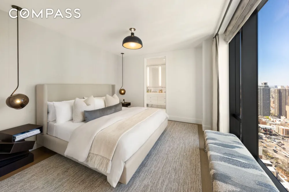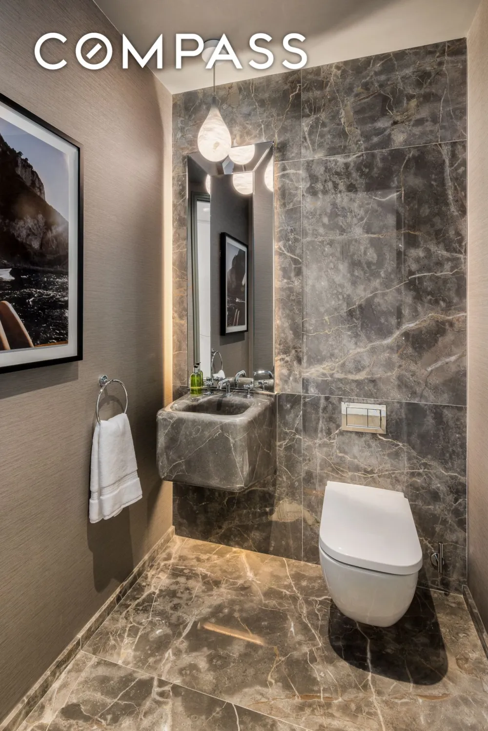 Designed by Thomas Juul-Hansen, the 1,049 square foot residence balances sculptural design and modern luxury. A gracious entry gallery leads to the corner living and dining room, where floor-to-ceiling windows flood the interiors with natural light and frame sweeping skyline and East River views. The open kitchen, crafted by Molteni & C-Dada, features custom Italian cabinetry, natural stone countertops, Gaggenau appliances, and dedicated wine storage, blending design with functionality. A refined powder room off the gallery is wrapped in richly veined stone. It showcases a sink sculpted from a single block of marble, creating a dramatic design statement for guests.
