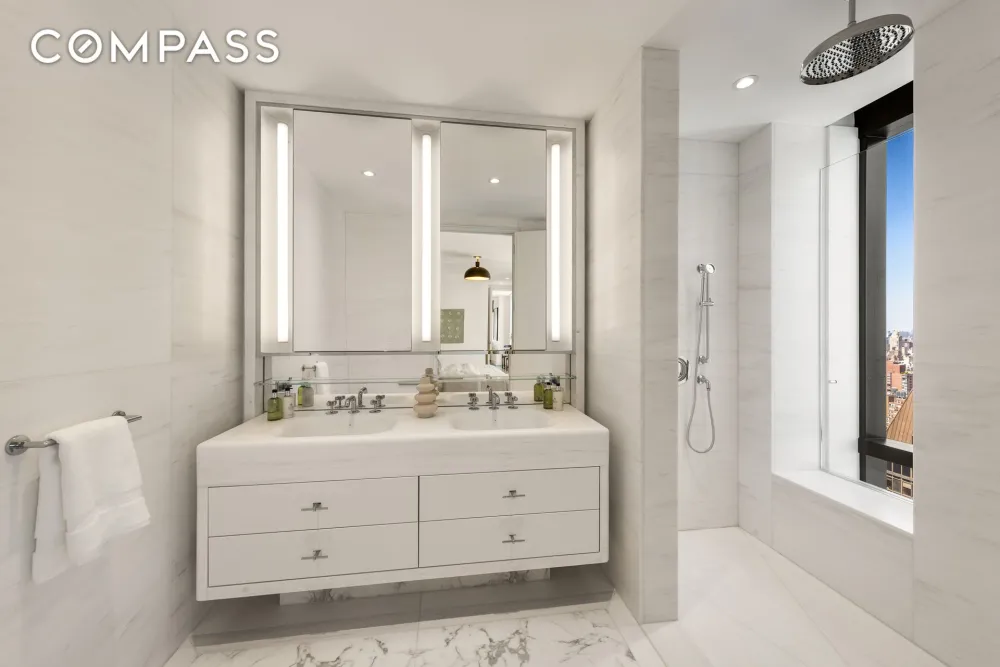 The primary suite is a private retreat, complete with a spacious walk-in closet and a windowed bathroom clad in stone. This elegant space features dual vanities with seamless marble basins sculpted from single slabs for a striking monolithic effect, a walk-in shower, and radiant heated floors. Wide-plank oak flooring throughout the residence and soaring ceilings enhance the sense of scale and sophistication.