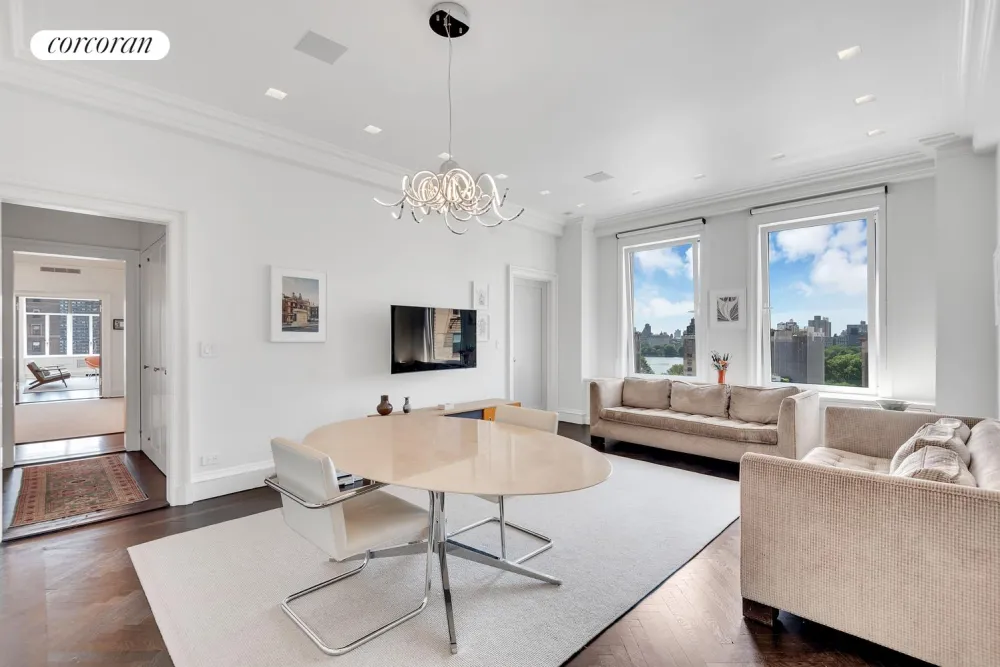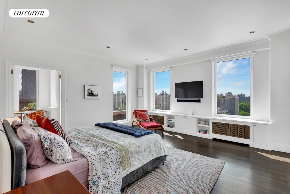 This sun-drenched 7-into 6-room corner home offers three exposures showcasing not only wide-open city and skyline views from every window but overlooks Central Park treetops and the Reservoir as well. Oversized picture windows frame north, south and west exposures drawing in fabulous natural light throughout the day and presents gorgeous sunset glow at days end. The primary suite features two terraces and a solarium, providing wonderful places to take in the city from all directions.