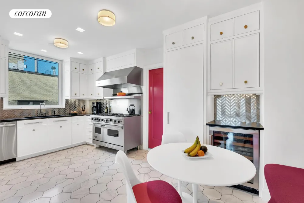 The stunning eat-in chef's kitchen was completely renovated and beautifully appointed with marble tile floors, granite counters, custom stainless backsplash, and abundant custom cabinet and pantry storage. To the delight of any level cook, top-of-the-line stainless appliances include Sub Zero refrigerator and wine refrigerator, Viking 6-burner with griddle and grill gas range oven with professional vented hood, and Bosch dishwasher. A built-in breakfast banquette completes the space.