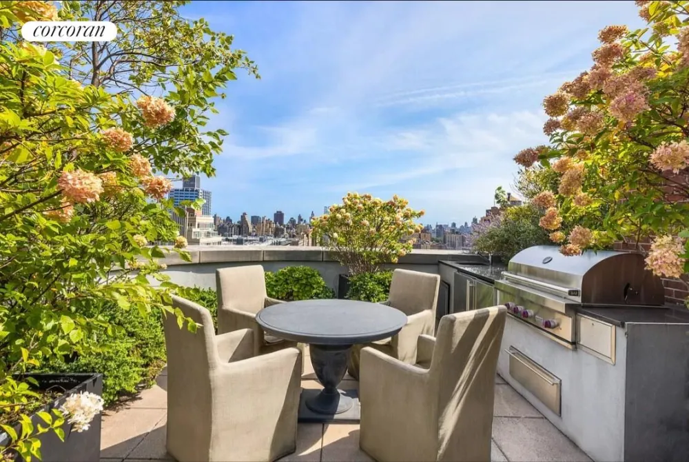 An elegant staircase and an interior private elevator lead to the fully landscaped roof terrace outfitted with an outdoor kitchen, gas grill, multiple seating areas, and an outdoor fireplace.