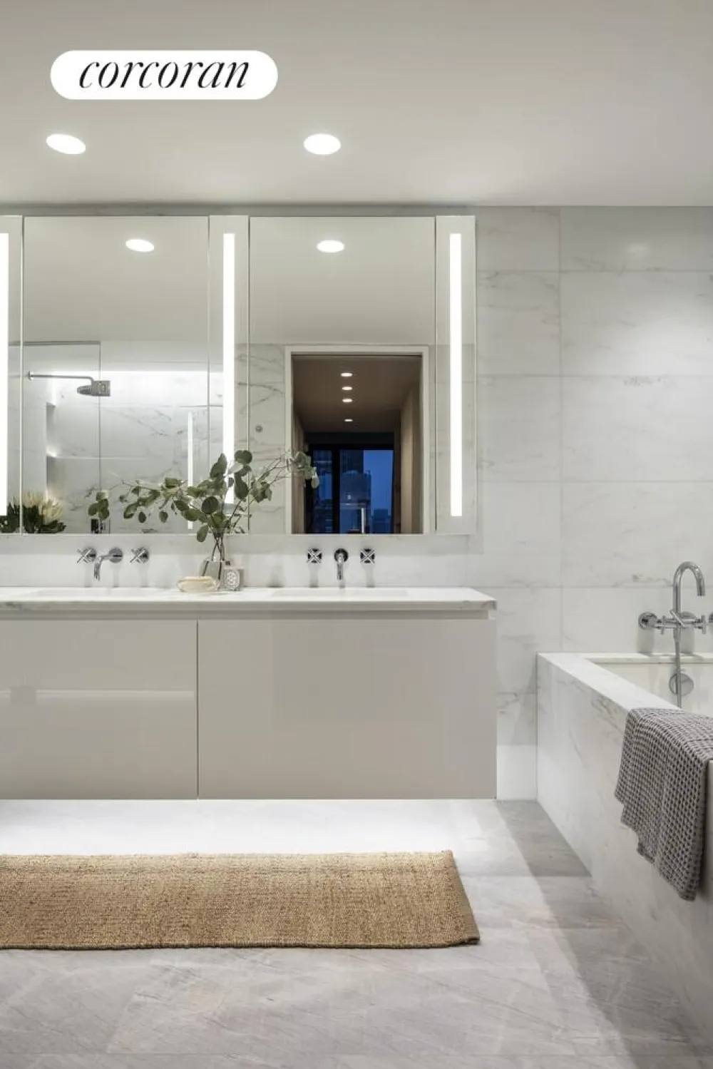 Designed by Meier Partners, the residence interiors are a striking contrast to the black glass exterior, reflecting a white color palette. Living spaces are immersed in natural light radiating through the floor-to-ceiling windows. White oak floors are found in all residences and open kitchens boast white Calacatta Lincoln marble counters, Dornbracht fixtures and Gaggenau appliances clad in custom-crafted Italian white lacquer. Each residence is equipped with a built-in Crestron smart home system that regulates temperature, lighting and the motorized window shades. These functions can be seamlessly controlled by residents through any iOS or Android device.