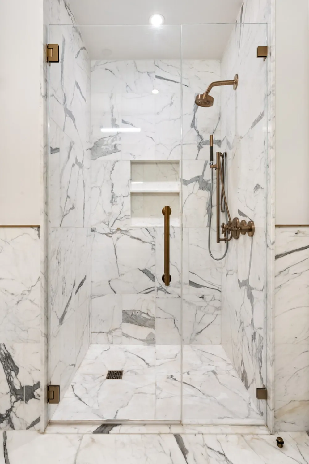 The serene primary suite easily accommodates a king-sized bed and offers open-sky views, two oversized custom closets, and a spa-like ensuite bath. Clad in statuary marble with bronze accents, it features a deep soaking tub, glass-enclosed shower, radiant heated floors, and an atmosphere of complete tranquility. The second full bath is equally refined, finished with brushed bronze fixtures and a sleek walk-in shower.