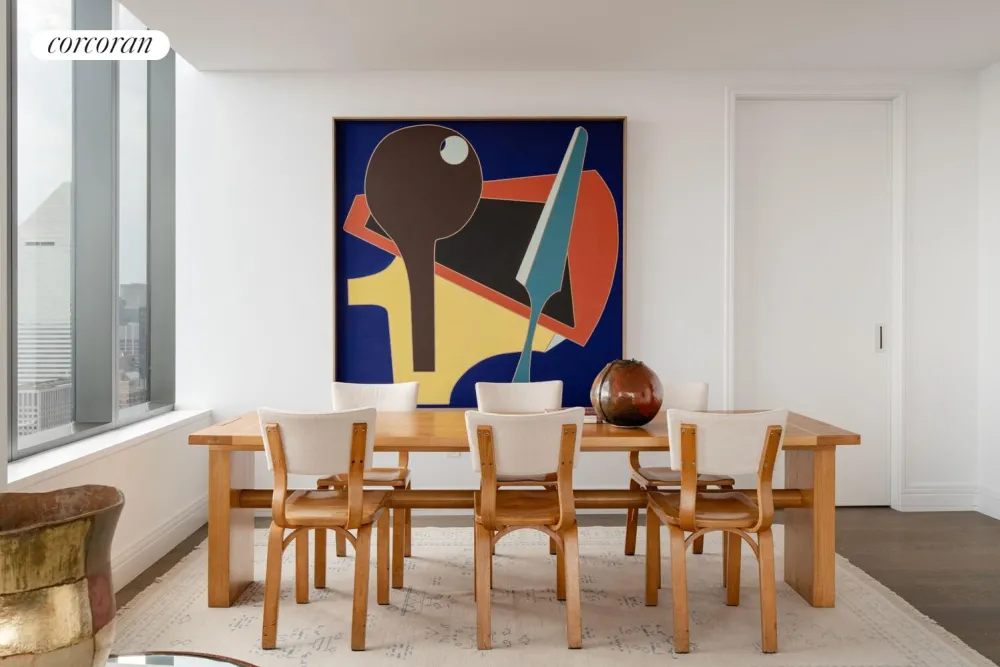 62A is a three-bedroom, three-and-a-half-bathroom residence featuring 2,301 square feet of interior space. The dramatic entry gallery leads to a gracious living and dining area that offers southeastern exposure and oversized windows. A south-facing eat-in kitchen offers Statuarietto marble countertops and Italian custom-crafted matte lacquer white cabinetry adorned with Sub-Zero and Wolf appliances.