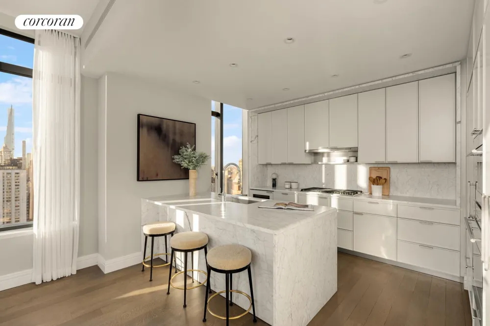 52B is a three-bedroom, three-and-a-half-bathroom residence featuring 2,106 square feet of interior space. The dramatic entry gallery leads to a gracious living and dining area that offers southwestern exposure and floor-to-ceiling windows. An open kitchen offers Statuarietto marble countertops and Italian custom-crafted matte lacquer white cabinetry adorned with Sub-Zero and Wolf appliances.