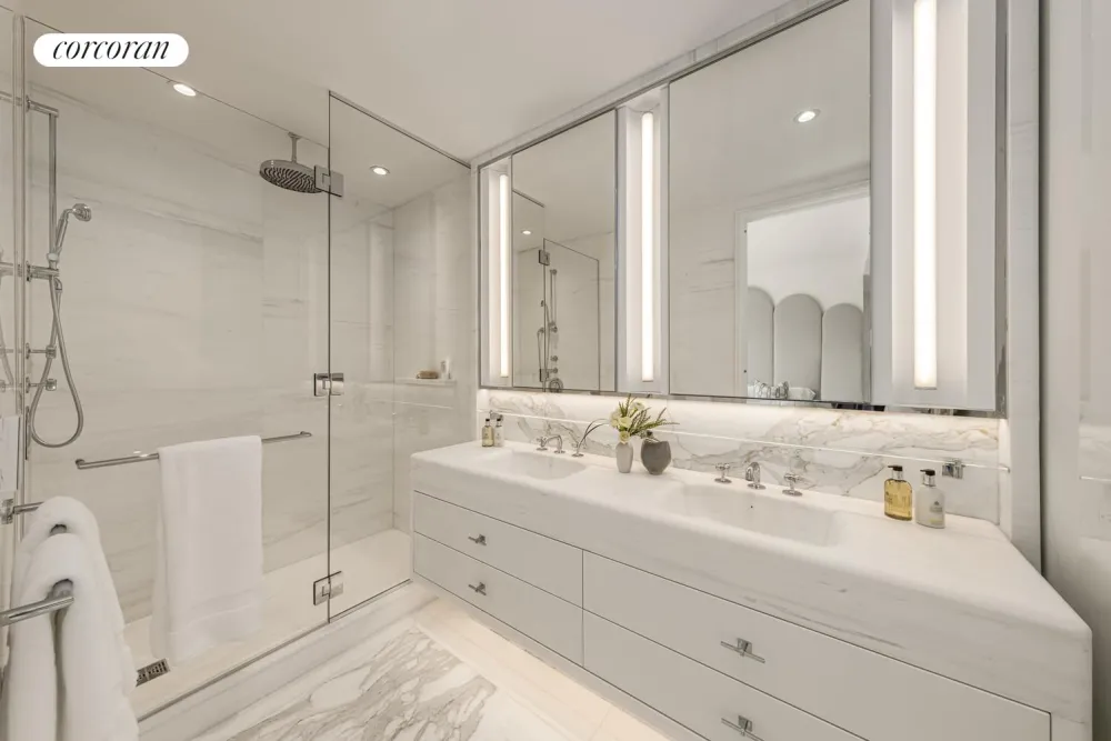 The south-facing primary bedroom boasts ample closet space, an en-suite bathroom elegantly ornamented with Bianco Dolomiti and Calacatta Gold marble, and Toto Neorest water closets. The secondary bathroom is embellished with an Italian custom-crafted lacquer wood vanity, honed cloudy mist marble floors and shower walls, glacier white Corian countertops with integral sink, and a Duravit water closet. Residence features include 5" solid oak plank quartered and rifted flooring, 4 pipe HVAC for year-round climate control.