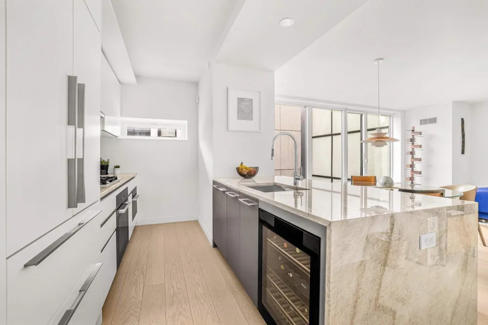 The primary bathroom features white Calacatta marble, a white oak vanity, a huge walk-in shower and Dornbracht faucets and fixtures. The second bath features grey Calacatta Lincoln marble with a white oak vanity, spacious soaking tub and shower with Dornbracht faucets and fixtures. Included are a Miele Washer and Dryer.