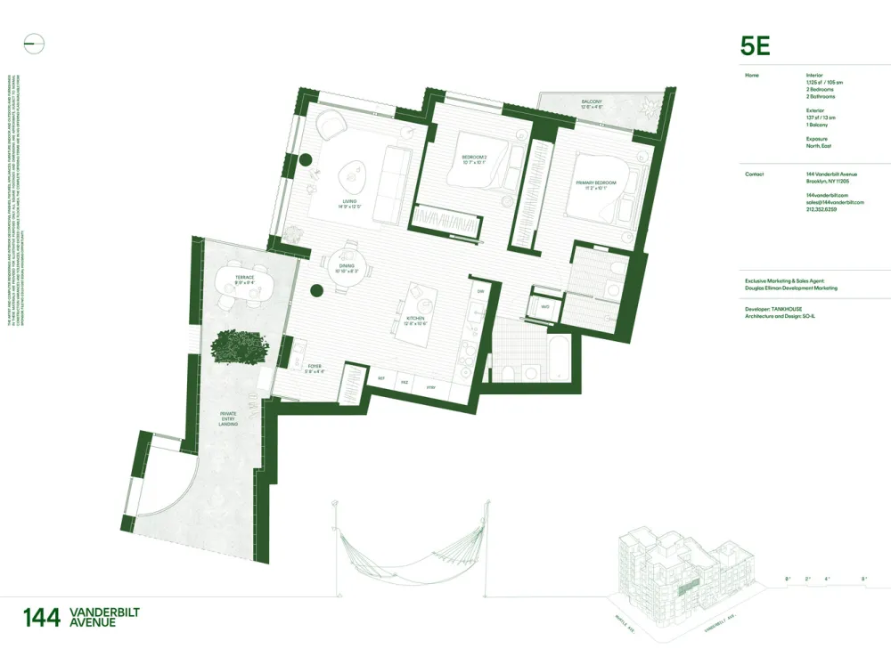 Residence 5E comprises 1,125 SF, offering two bedrooms, two bathrooms, North and East exposures and 137 SF of private outdoor space. Upon arrival through a separate entry landing, white oak floors, exposed concrete ceilings and natural lighting set the tone for modern, design-forward living.