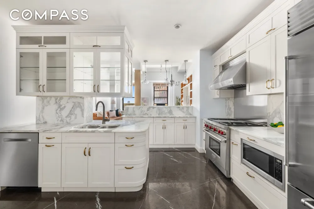 The STUNNING chefs kitchen features top-of-the-line finishes and appliances. The house size OPEN kitchen concept measures 15.4 X 15.7 and features Statuario marble counters & backsplash, a separate storage/pantry area ideal for large cooking appliances, as well as a beautiful breakfast bar which is ideal for casual dining.