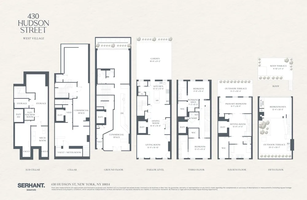 This rarely available property features a ground-floor commercial space, formally occupied by the Michelin-starred restaurant Piora, with two full cellar levels, along with a private, fully renovated owner's unit with 4 bedrooms, 3 full bathrooms and two powder rooms, plus four fantastic outdoor spaces including the lush garden, two terraces, plus a rooftop deck with sweeping open views which include the Empire State Building and Freedom Tower. 430 Hudson Street is comprised of approximately 6,543 total square feet, with 4,895 above grade and 1,648 below grade, plus 1,766 square feet throughout the 4 private outdoor spaces.
