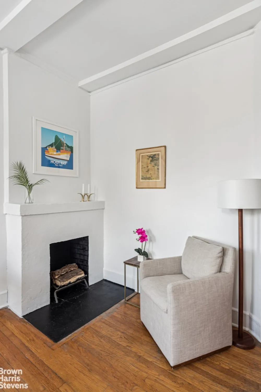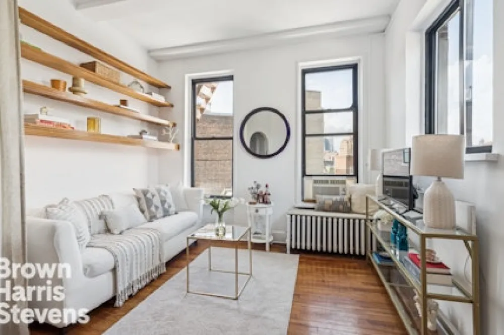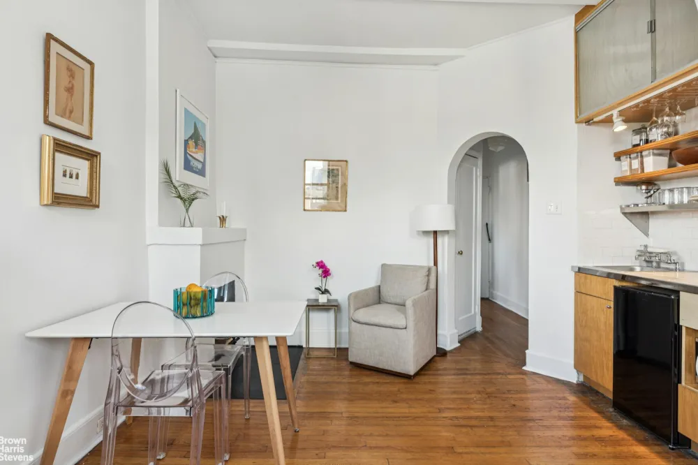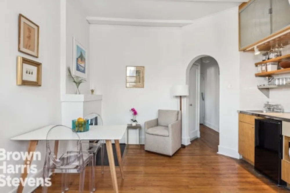 The bright and airy living room comfortably fits a queen-size sofa bed and features three oversized windows with custom built-in shelving, allowing you to enjoy dramatic skyline views. The efficient kitchen includes a two-burner cooktop, refrigerator, and room for a convection/microwave oven, along with thoughtfully designed custom shelving and overhead storage. Just across from the kitchen is a charming fireplace with space for a cozy reading nook. The windowed bathroom has been tastefully renovated with a stall shower and a stone sink. The bedroom enjoys northern and eastern exposures and includes a spacious, windowed dressing area with a large closet, offering both functionality and comfort.