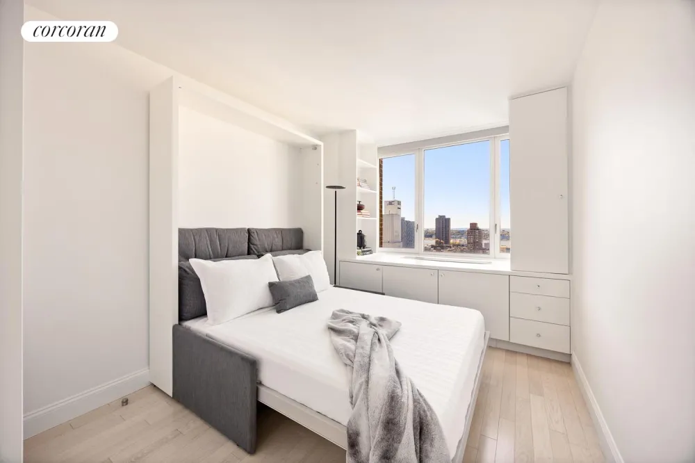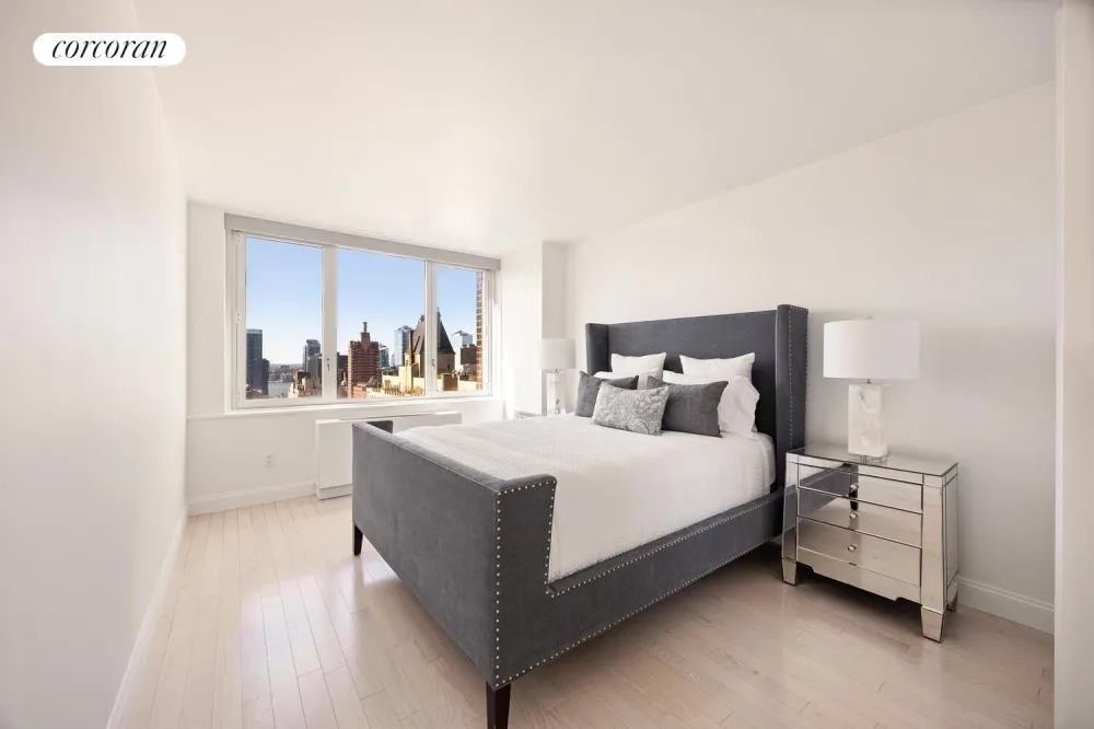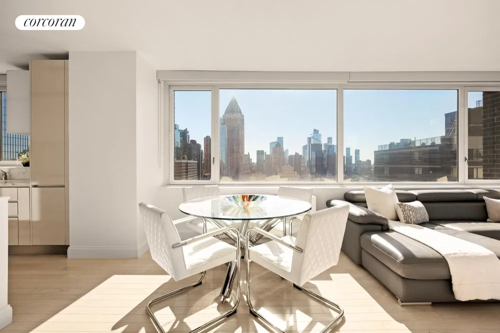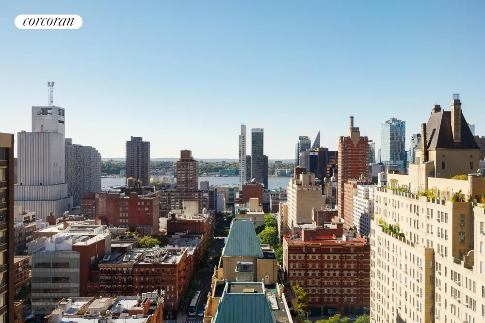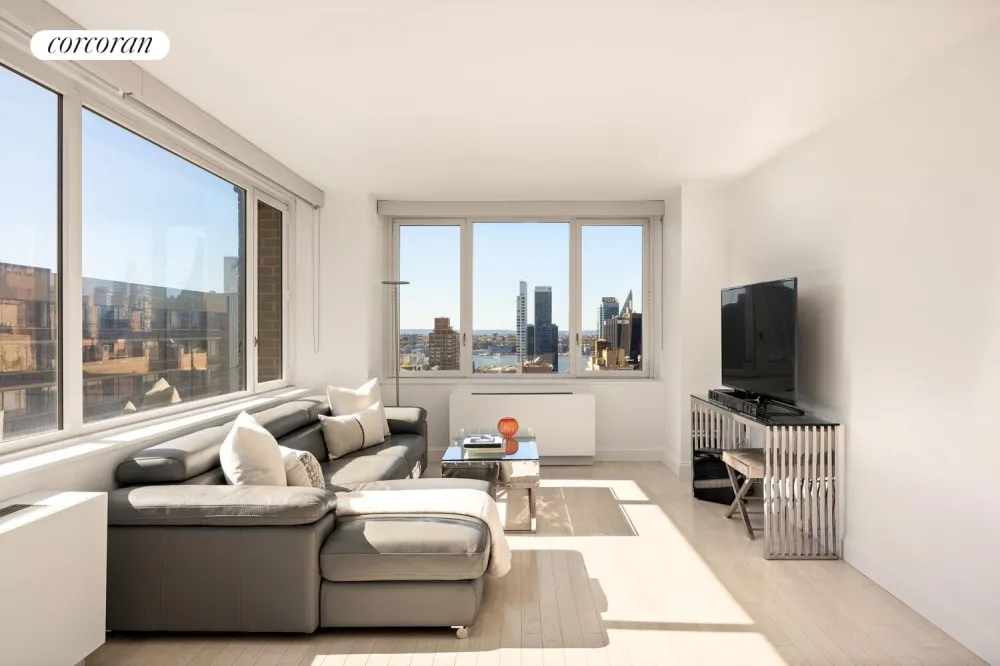Perched on the 30th floor of one of Manhattan's premier luxury condominiums, this sun-drenched corner two-bedroom, two-bathroom home boasts panoramic southern and western exposures, showcasing sweeping views of Downtown Manhattan and the Hudson River - including breathtaking sunsets right outside your windows.