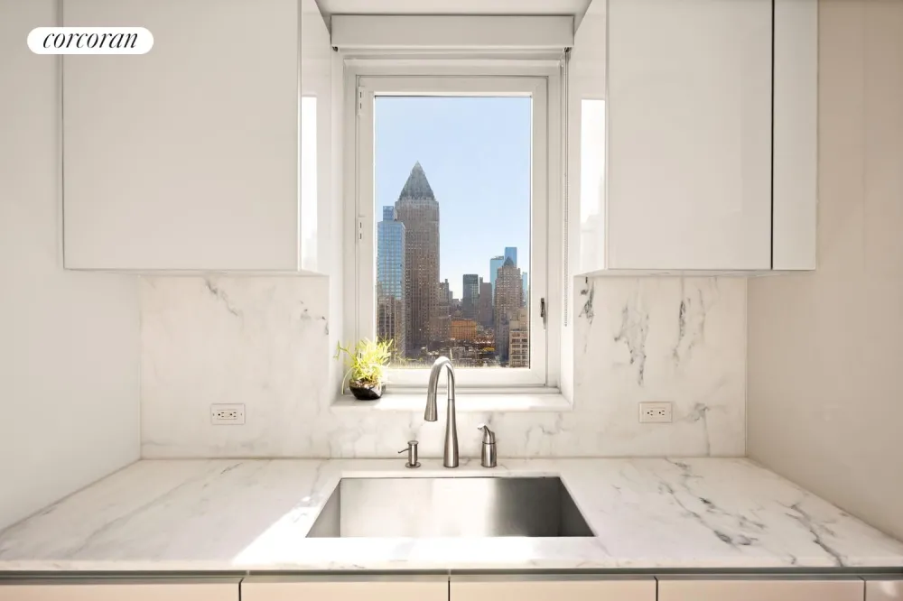 The expansive living and dining area is fully wrapped in nearly 25 feet of windows, flooding the home with natural light throughout the day. Whether hosting guests or enjoying quiet evenings at home, this is the ultimate entertainment space with a backdrop of iconic Manhattan views.