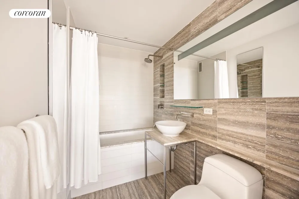 The primary suite offers a serene retreat with western exposure overlooking the Hudson, comfortably accommodating a king-size bed and additional furnishings. The en-suite bath is elegantly finished with modern details and includes a soaking tub/shower.