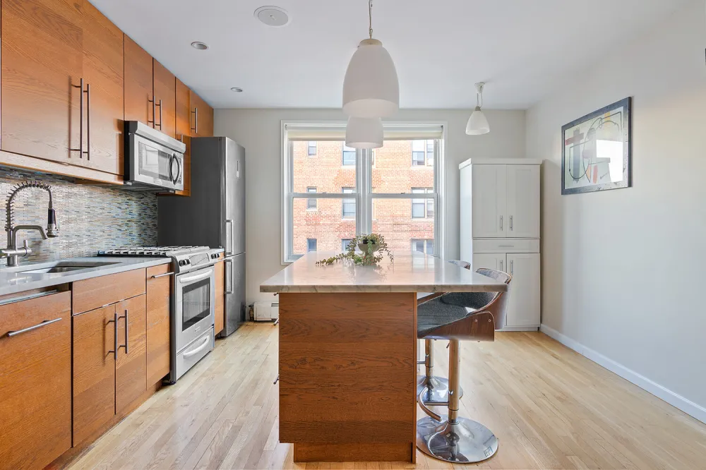 Step inside to a spacious living and dining area featuring a wall of built in closets and wide open views of Brooklyn's treetops. The windowed eat in kitchen is equipped with high end appliances and abundant cabinet space for easy storage and prep.